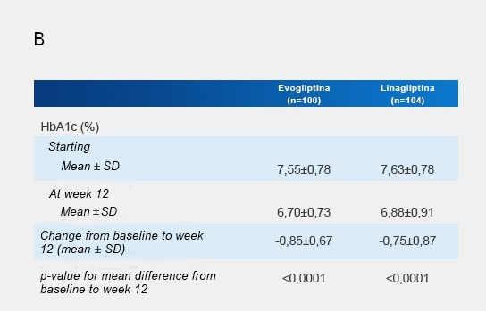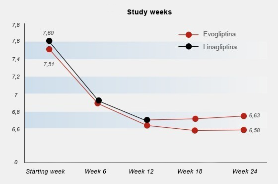 The objective of EVERGREEN10 study was to evaluate the efficacy, through the reduction of HbA1c and the modification of parameters of continuous glucose monitoring (CGM) and the safety of evogliptin, using linagliptin as an active control. In this double-blind, multicentric study, 207 patients with type 2 diabetes mellitus with HbA1c between 7.0 and 10.0% were randomized 1:1 to treatment with evogliptin 5 mg/day (n-102) or linagliptin 5 mg/day (n« 105) for 12 weeks, followed by an extension period of an additional 12 weeks.​​